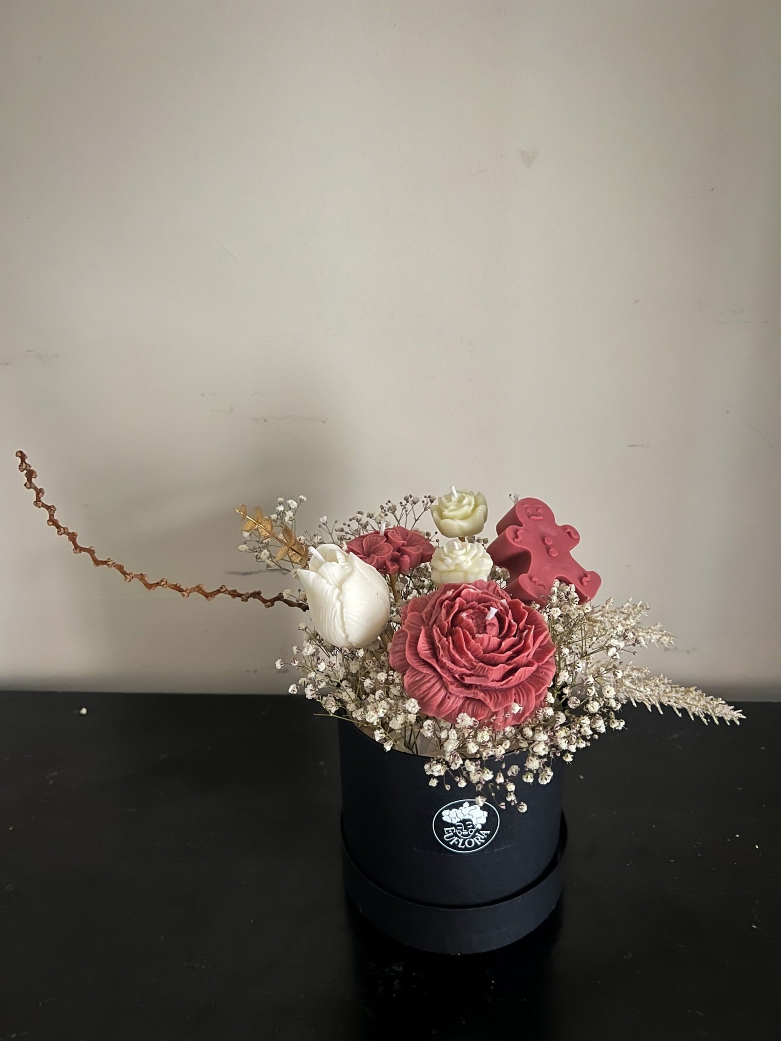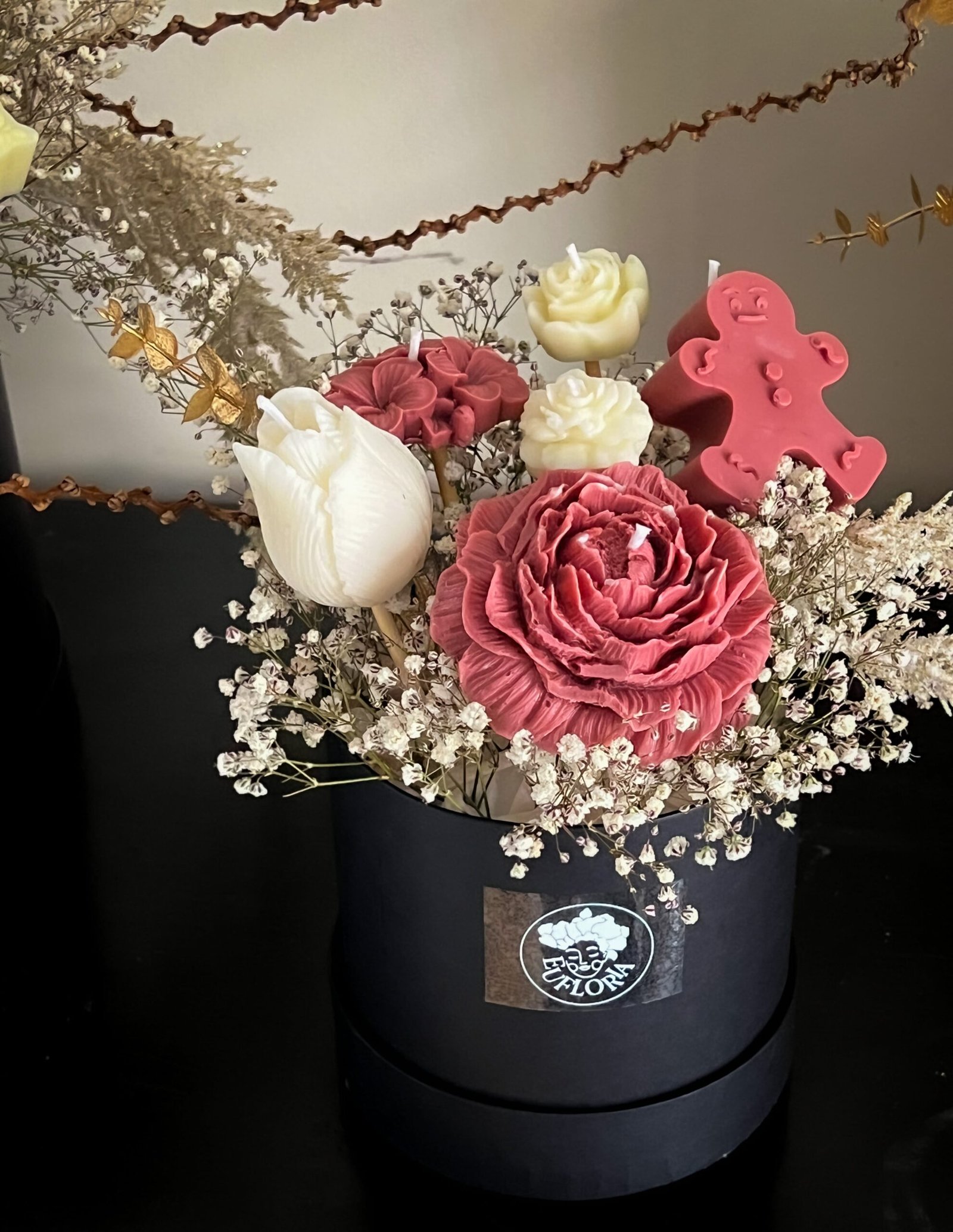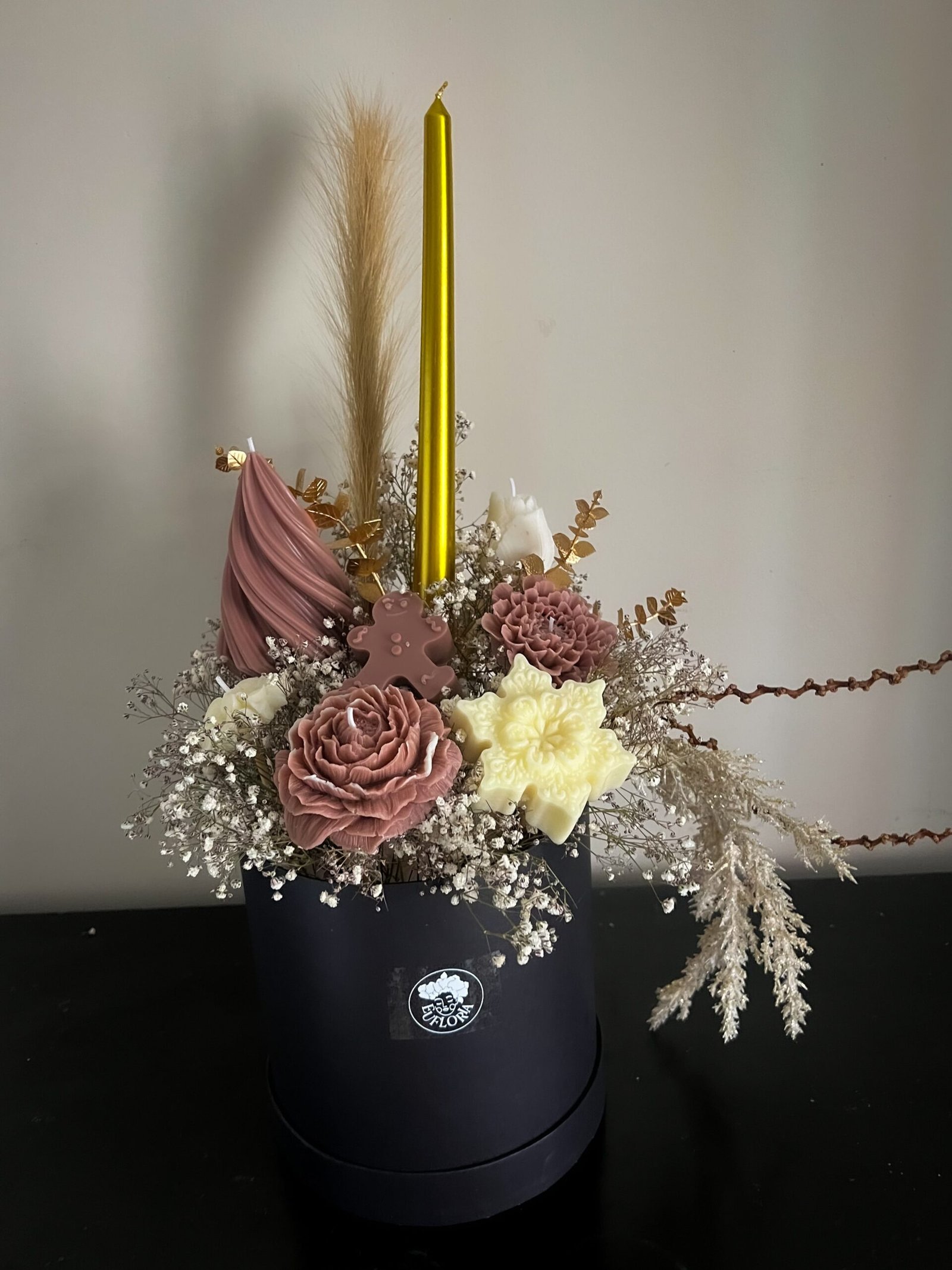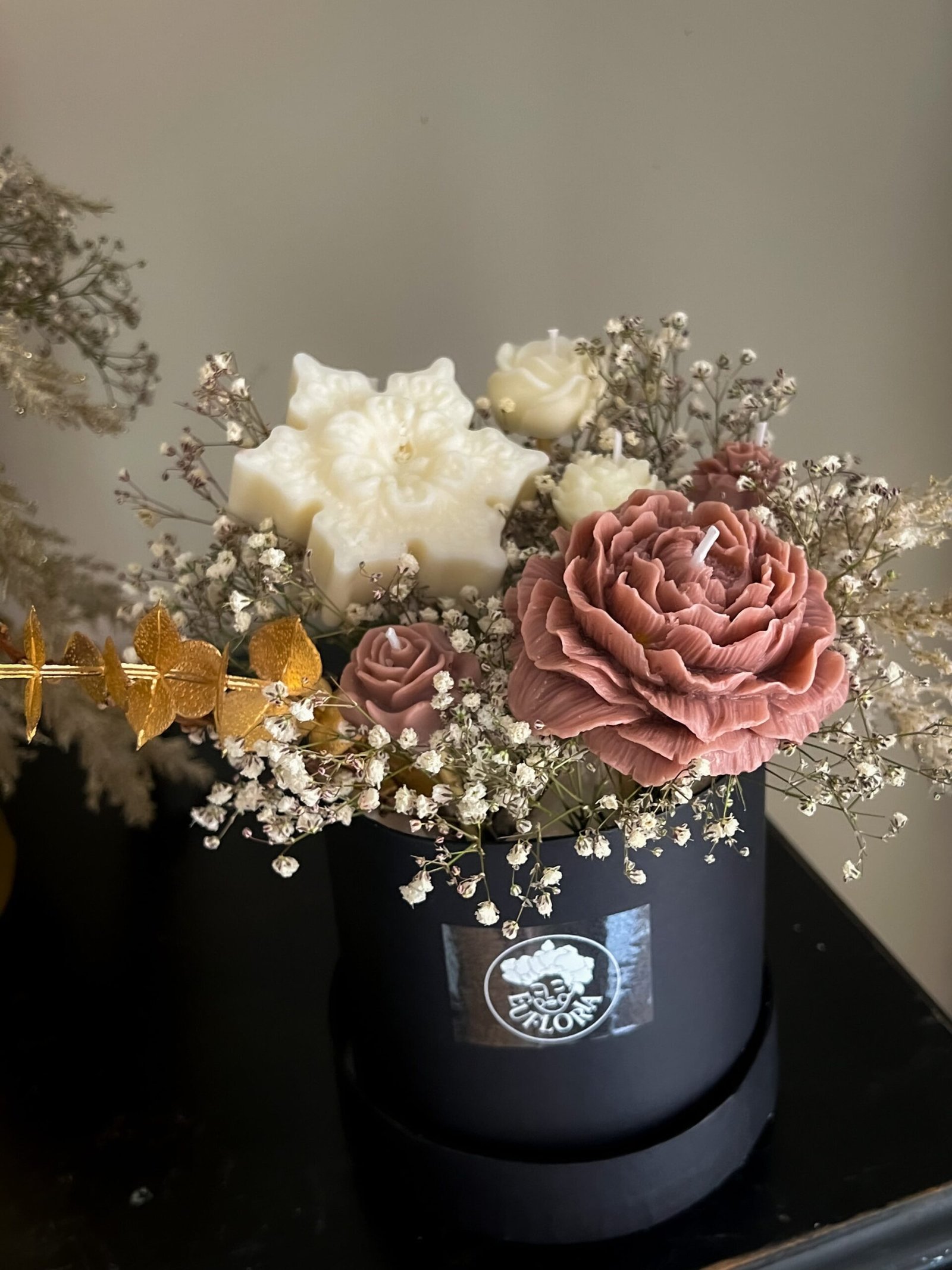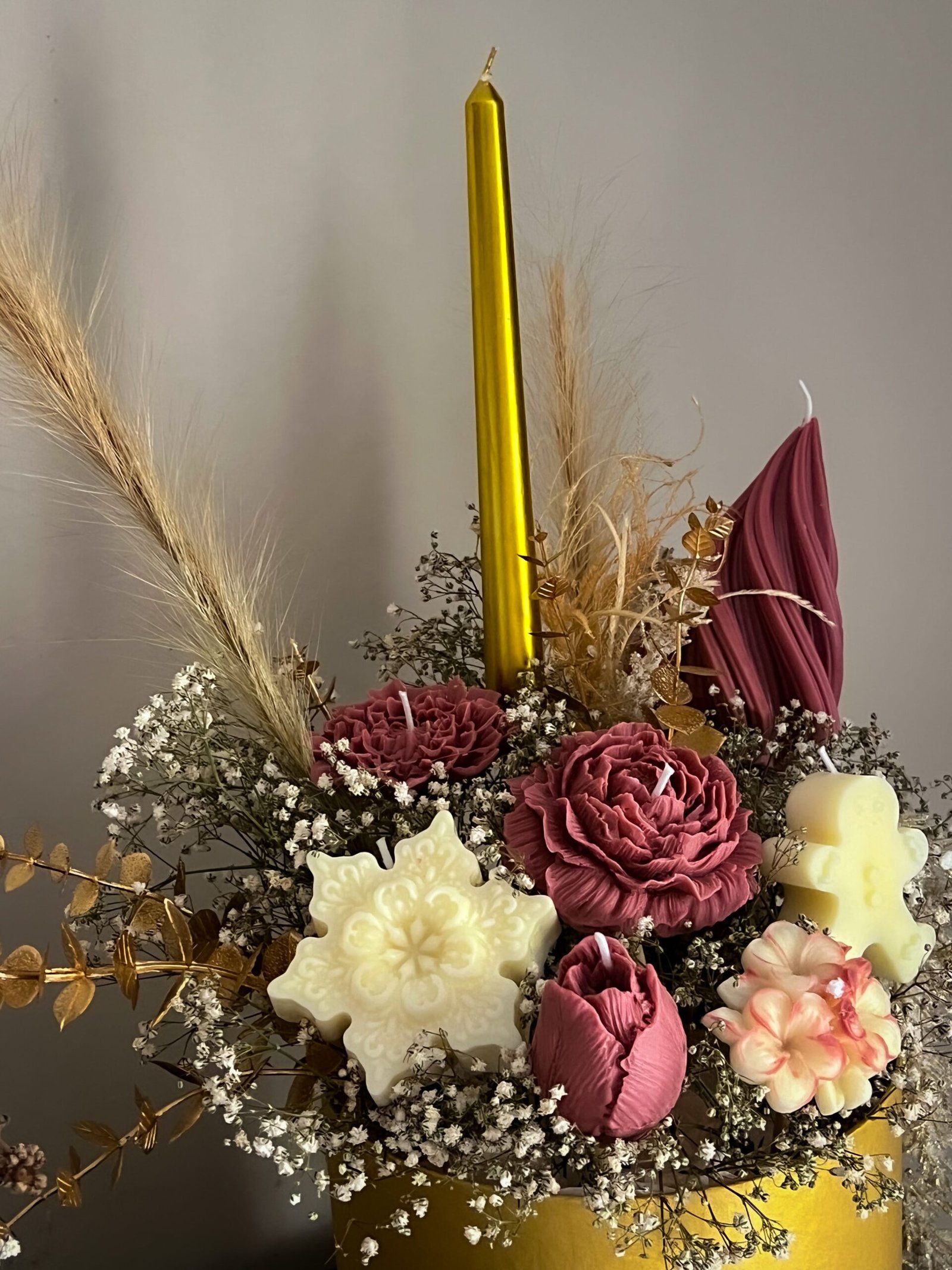 Flores desidratadas acolhem velas artesanais, criando pontos de luz entre pétalas e volumes.